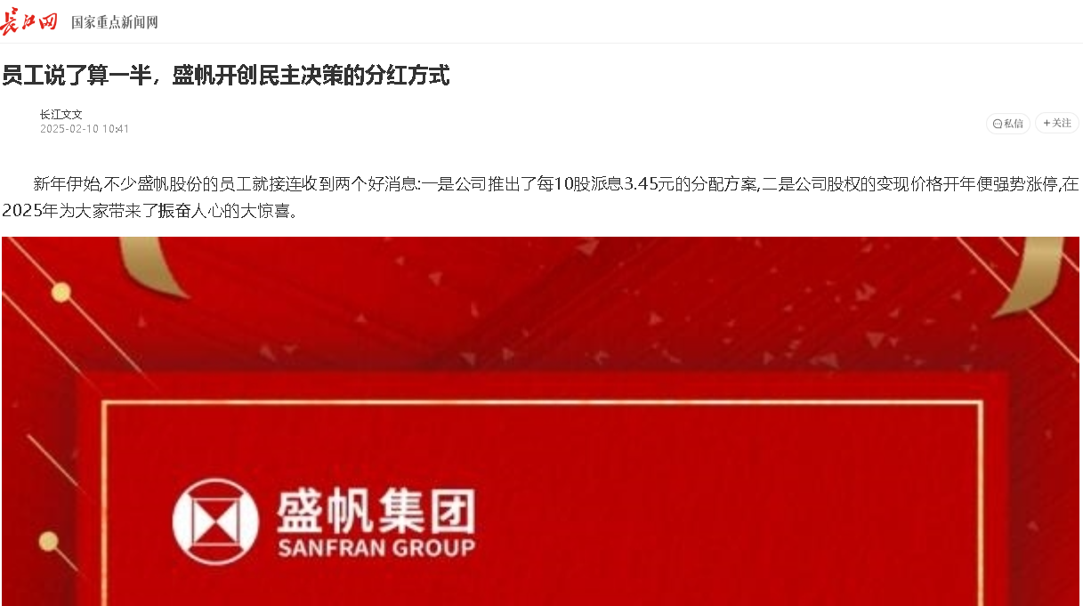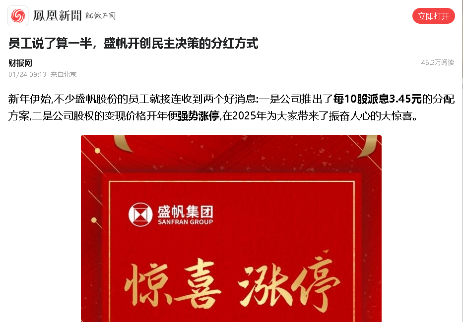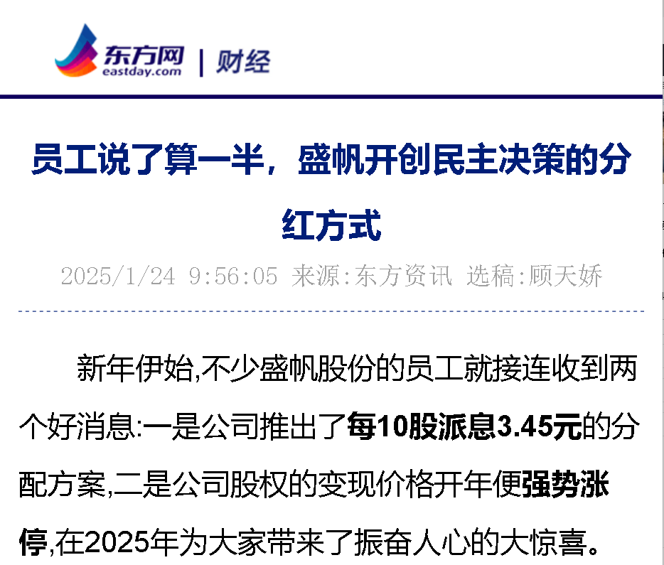 新年伊始,不少盛帆股份的員工就接連收到兩個(gè)好消息:一是公司推出了每10股派息3.45元的分配方案,二是公司股權(quán)的變現(xiàn)價(jià)···