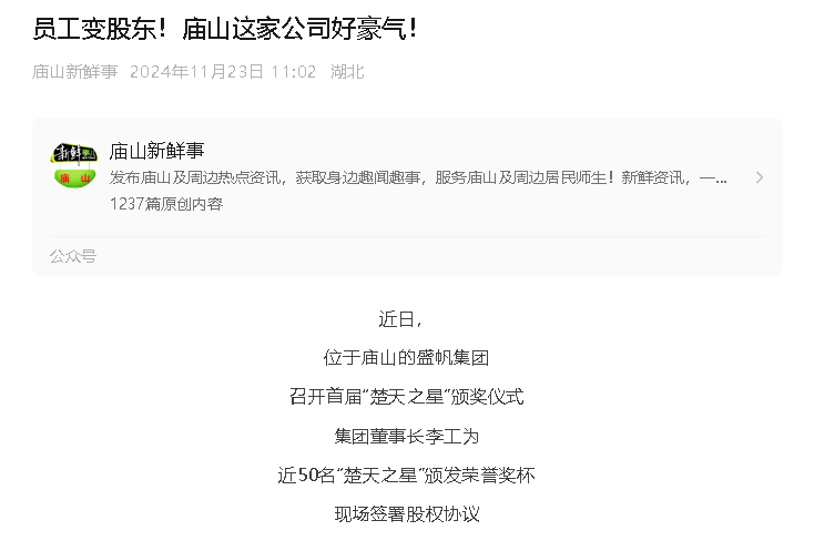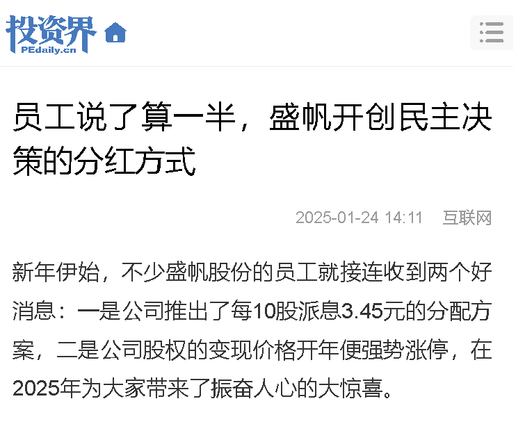新年伊始,不少盛帆股份的員工就接連收到兩個好消息:一是公司推出了每10股派息3.45元的分配方案,二是公司股權的變現價···